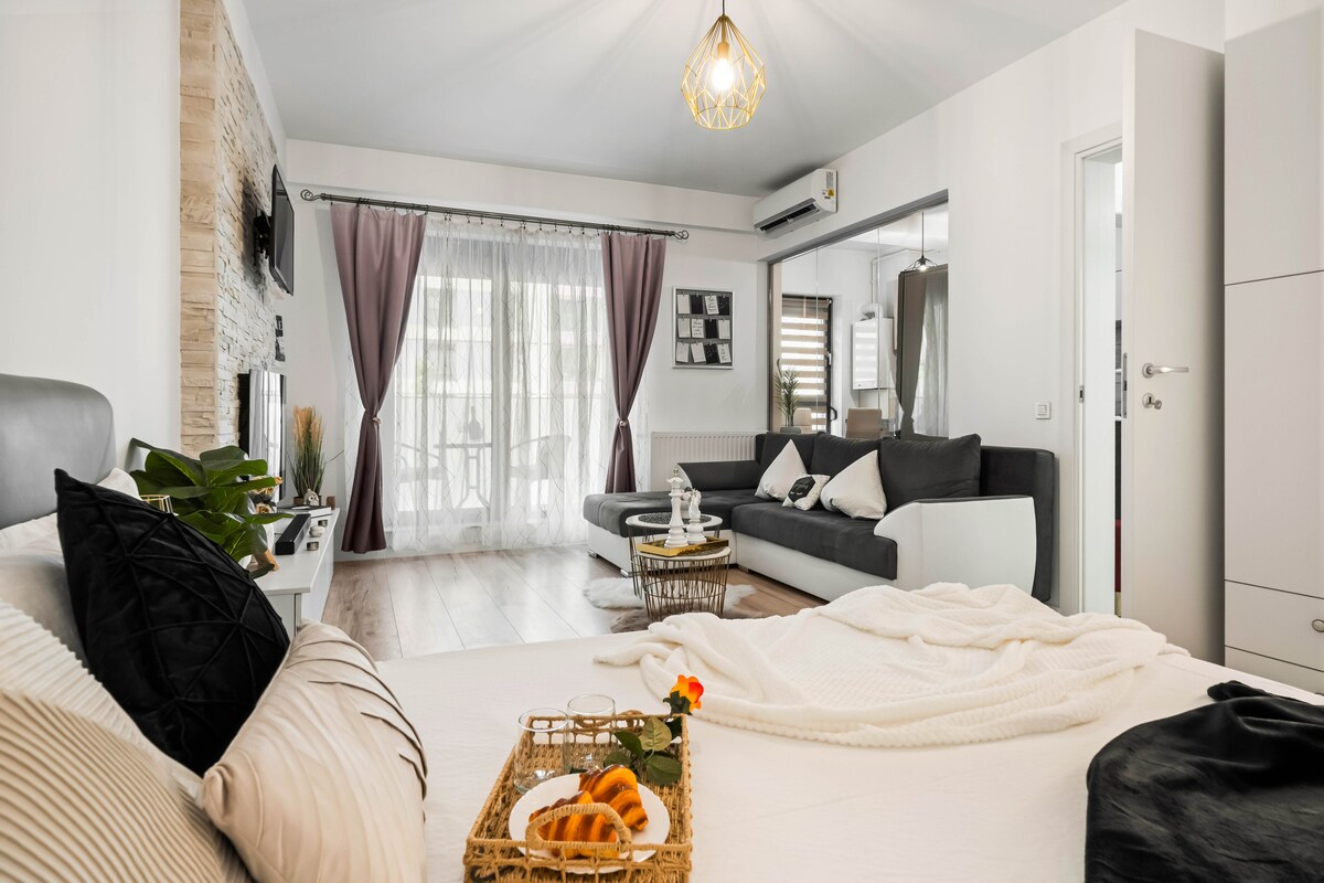 Welcome to Black Mirror - a stylish and modern apartment located in the heart of the city, just moments away from the iconic Calea Victoriei. Surrounded by vibrant cafes, fine dining, and cultural landmarks, this central location offers the perfect base for exploring everything the city has to offer. With everything just steps away, Black Mirror offers the ideal urban retreat.