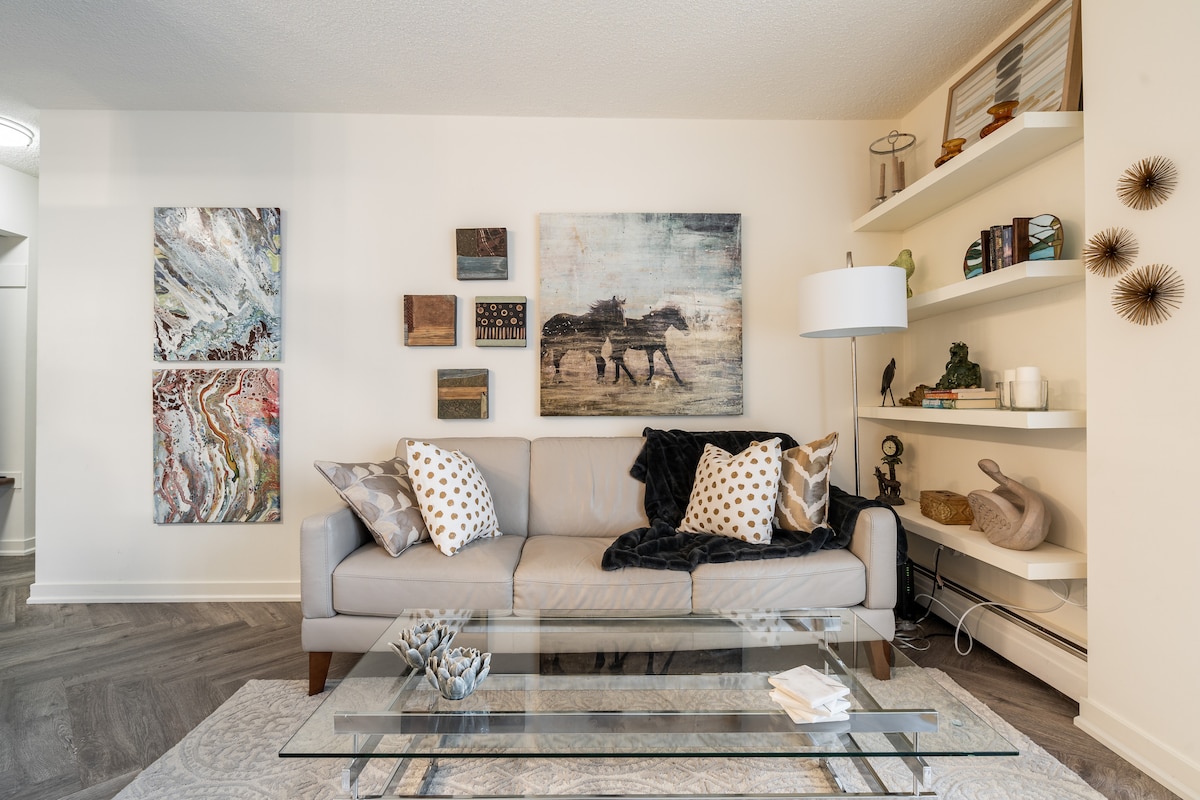 This 500 sq.ft. bright, trendy, renovated ground floor condo is in the centrally located neighbourhood of Hillhurst! Walk anywhere: 10 minutes to SAIT, North Hill Mall, CTrain stations; 15 minutes to Kensington; 20 minutes to downtown. Enjoy a well-equipped kitchen, dining area, quality bathroom amenities, free wifi and parking, smart TV (access your own Netflix, Hulu, Prime Video, etc), and paid laundry just down the hall. The Hillhurst Retreat is your perfect home base for exploring Calgary!