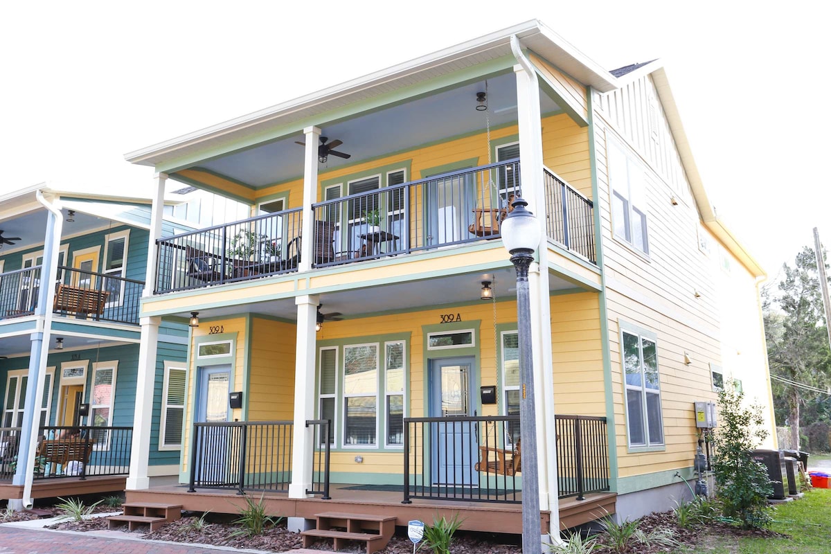 The Botanical Suite is a newly built, freshly stocked, sparkly clean, unique upscale stay in the heart of GNV! ▻ Walk to University of Florida & Downtown G'ville ▻ Includes all amenities you could ever want! ▻ 3 bdrms & 2 baths ▻ 7 beds for up to 10 guests (incl. 2 Kings) ▻ Fully equipped & family-friendly (incl. Pack n' Play) ▻ Hangout outside on the stylish Porch ▻ This downstairs, single floor space is all yours!