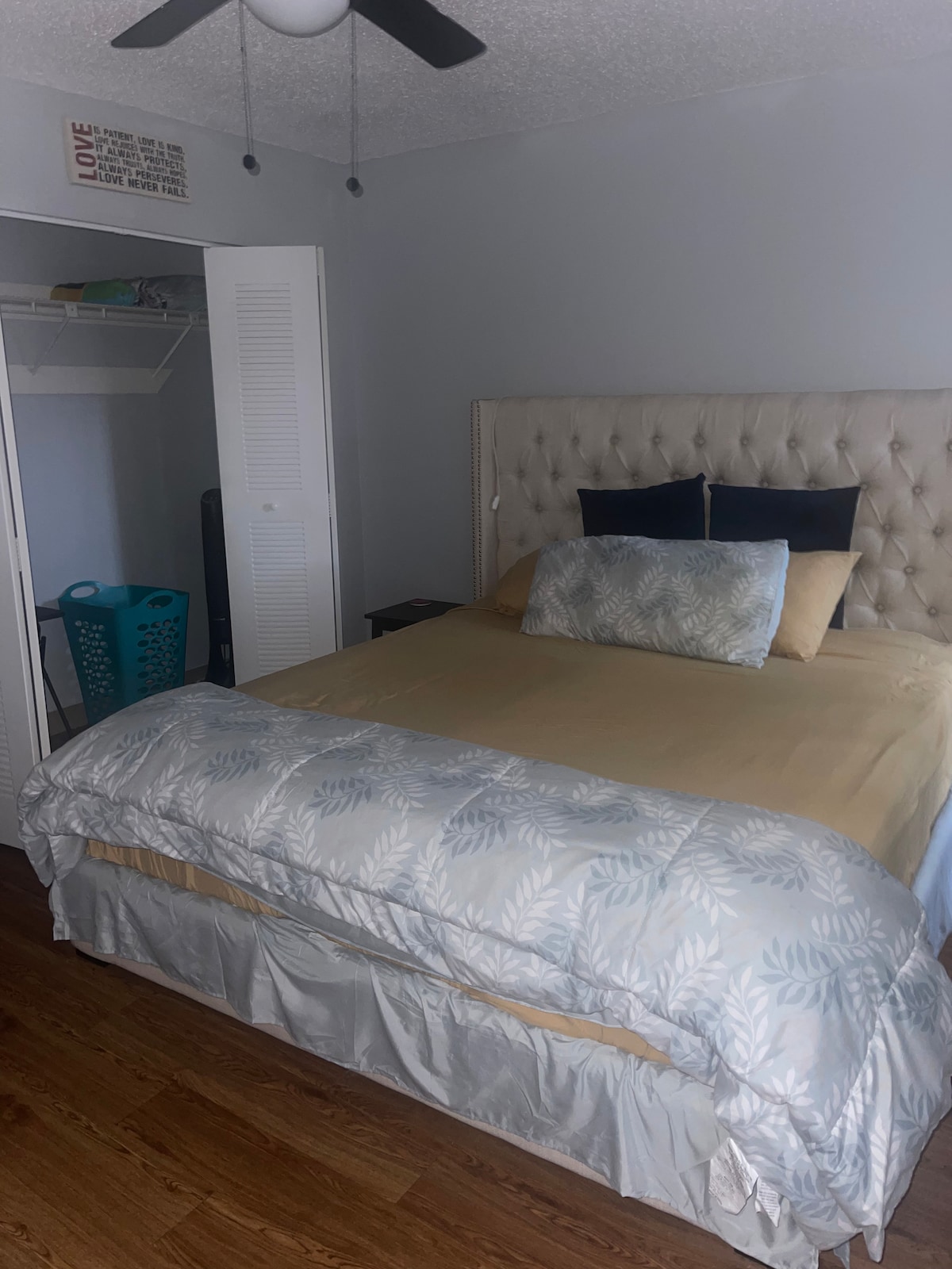 Comfortable condo located one block from Shands Hospital, VA Hospital, two blocks to the University of Florida Campus, and 1.5 miles to the football stadium (30 minute walk). The ground level condo is a two bedroom/1 bathroom. Each bedroom has a walk in closet, queen bed, chest of drawers. The kitchen is fully furnished with dishwasher, gas stove, microwave, and dishes. High Speed internet and cable are included. Sleeps 4 comfortably- No Dogs are allowed in the complex.