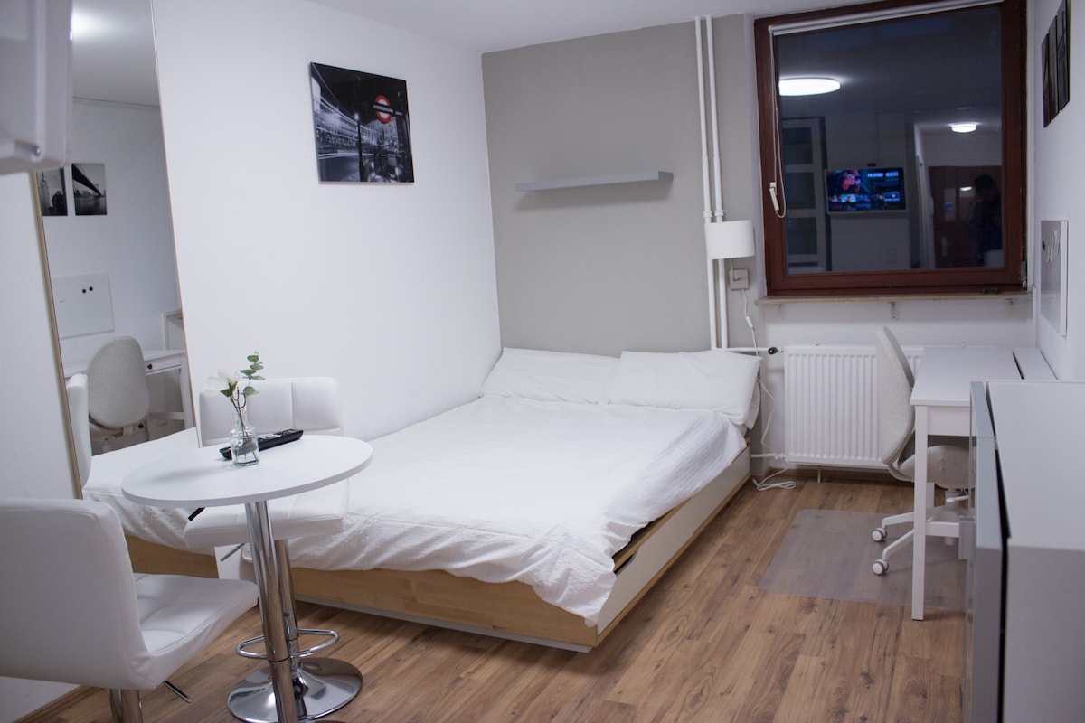 We guarantee you a great stay! My apartment is within the very city centre of Mannheim. You can easily walk to the main station! Restaurants, bars, University, MBA school and shopping are only steps away. Perfect for single travellers and business travellers. High-speed WIFI included" Fresh bedding and fresh towels included Small kitchen with basic equipment Queen-size bed desk for work laundry machine and dryer within facilities