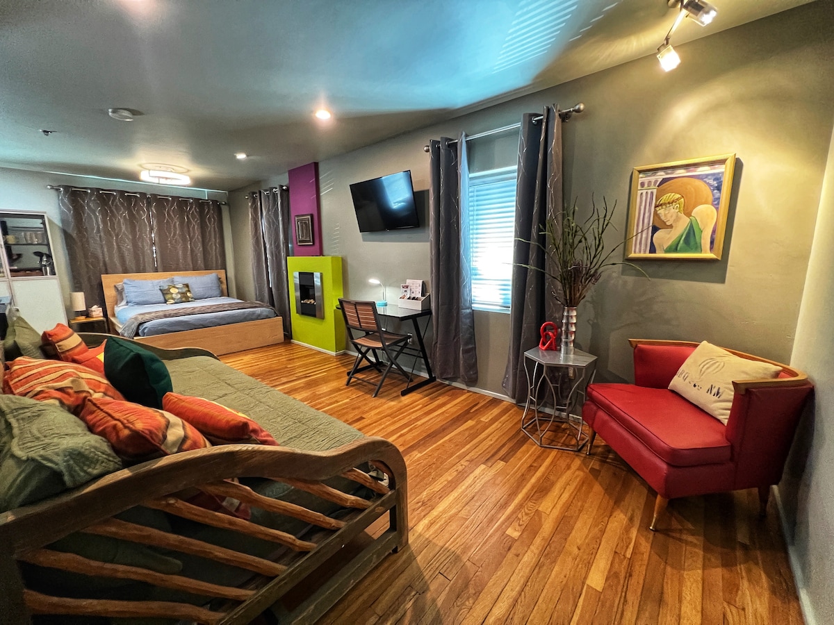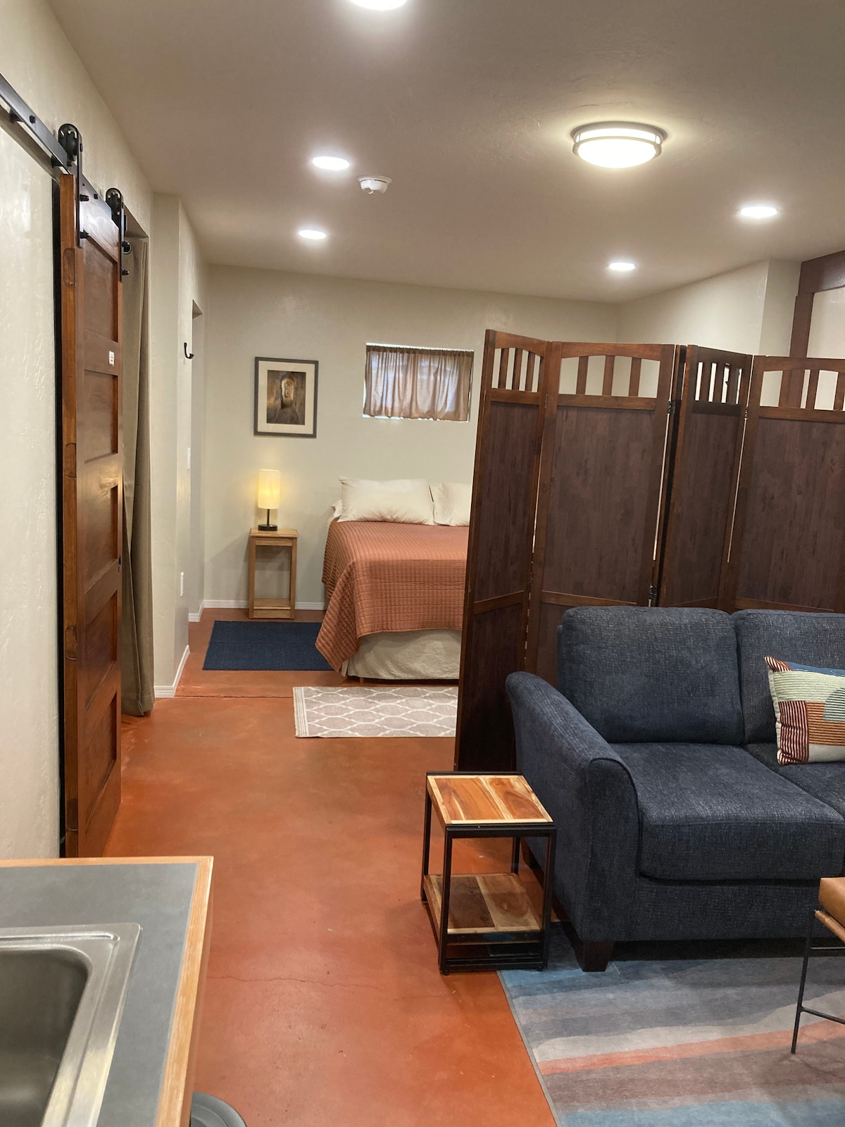 This turn of the century rare two car garage is now a very well appointed studio apartment. It's open but defined spaces leave you feeling relaxed while works great as a base camp for your explorations of Albuquerque and beyond. It comes with a cozy yet high-end kitchen. The bathroom space is pocket-size with plenty of style. Some my find the bathroom space challenging. Located north of downtown on the fringe of a quiet residential area. Plenty of cafes, breweries, coffeeshop in walking distance