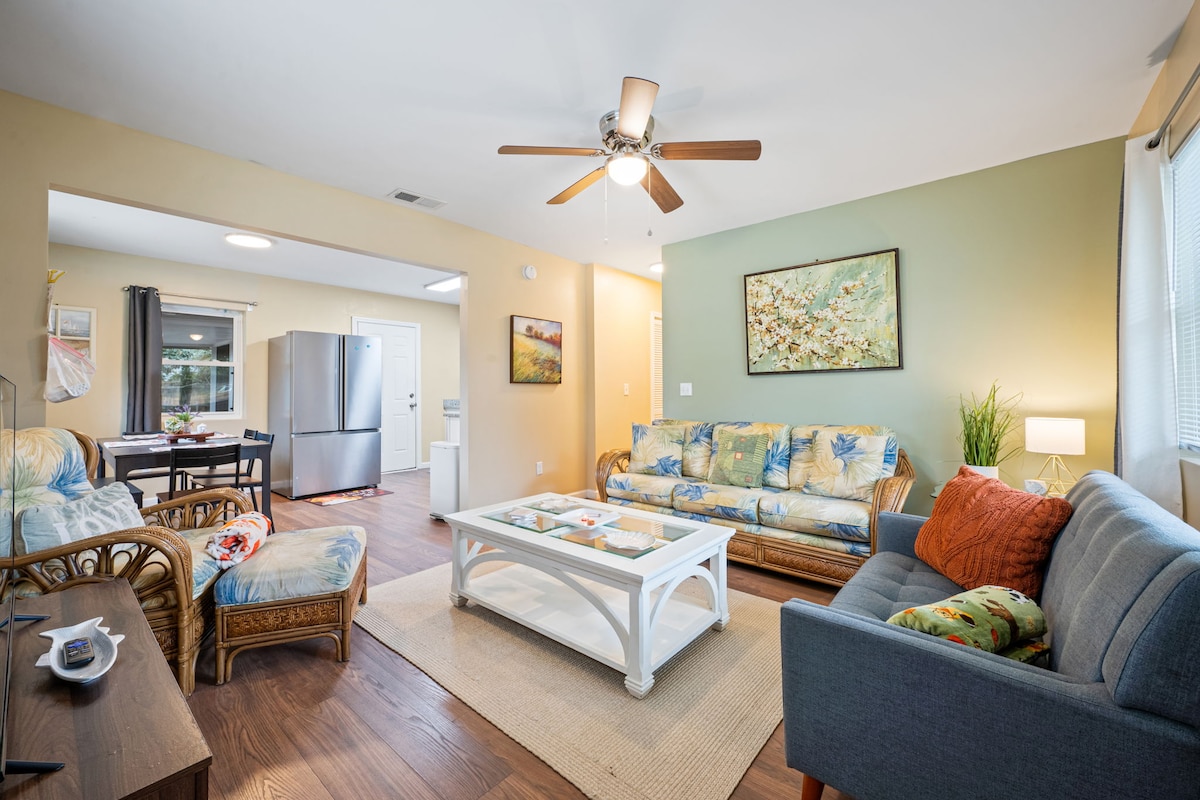 Experience cozy charm and comfort amid lush tropical landscaping. Step through the wooden gate and stroll along the shell-stepping stone pathway to the inviting backyard and charming cottage. Rebuilt from the ground up, this chic oasis boasts a kitchen with brand-new appliances, including a full-size fridge, freezer, ice maker, garbage disposer, convection-oven-microwave, and sleek granite countertops. Unwind in the separate comfortable queen bed and enjoy the smart TVs and high-speed internet.