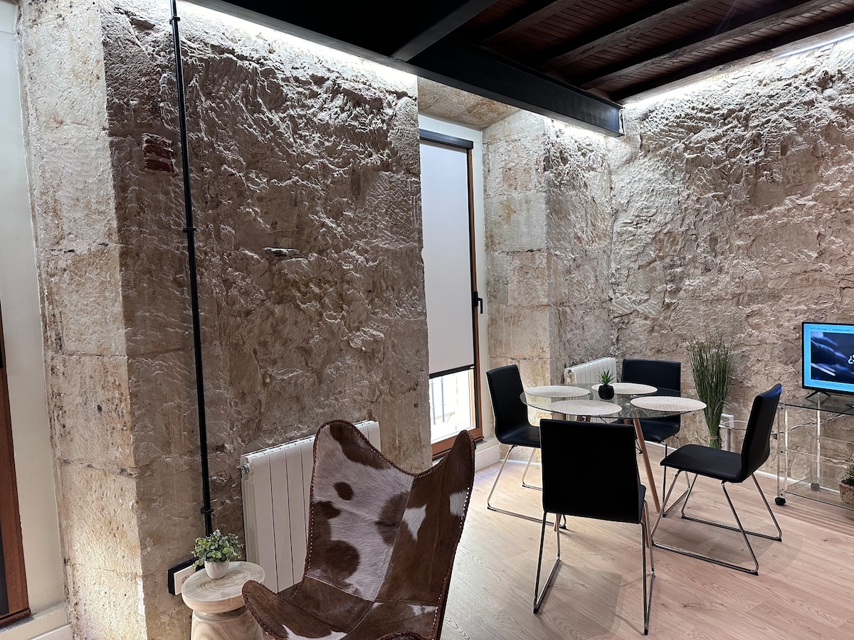 Apartamento de lujo a estrenar y al mejor precio. Situado en la calle Concejo a un minuto de la Plaza Mayor de Salamanca. Una vivienda ideal para una pareja que desee vivir con las características de un hotel 5 estrellas, servicio de limpieza, wifi, Netflix, chimenea... Un apartamento perfecto para relajarte y al mismo tiempo vivir en pleno centro, al salir del apartamento lo primero que te encuentras es el arco de la Plaza Mayor.