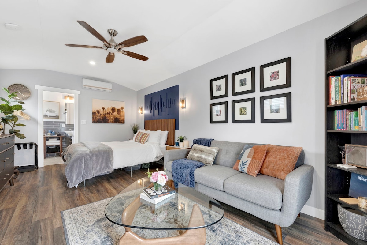 Suite Mary is a newly build small 375 square foot downstairs studio with your own private entrance. If safety is your concern the structure was built with all the latest Los Angeles City Code requirements as of 2016. Some of these features include; fire alarm system connect with ceiling sprinklers, green building requirements as well as an electric vehicle charging station available to all our guests.