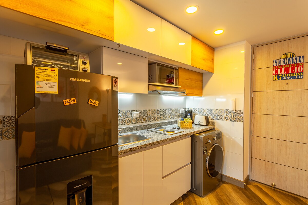 Acogedor apartamento, el cual cuenta con cama doble, televisor, escritorio, sofá, armario, baño privado y cocina con todos los implementos y electrodomesticos necesarios para uso del huésped, todo nuevo. El conjunto esta ubicado en una zona muy central, cerca del centro historico e internacional, donde se encuentran los mayores atractivos de Bogotá. Con vias de facil acceso y sistemas de trasporte publico que conectan el centro con el aeropuerto y la terminal de transporte.