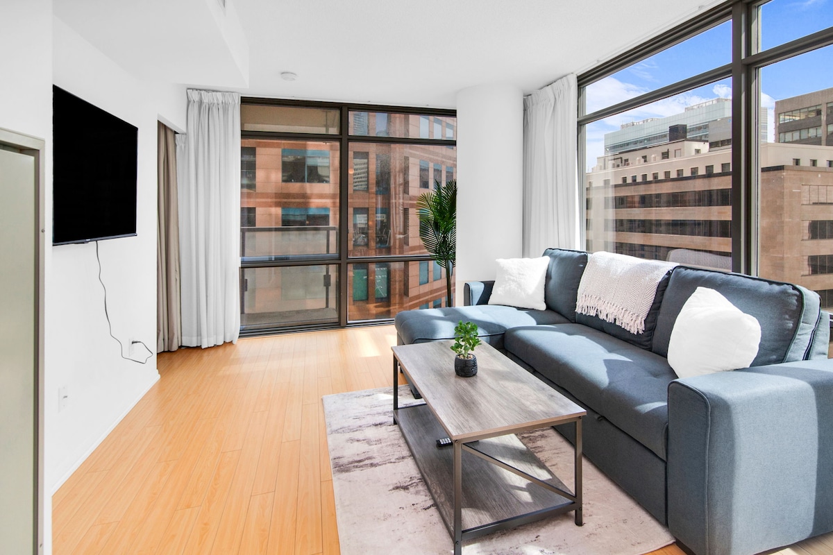 Gaze at a seemingly unending city view through the floor to ceiling windows of this condo that sits high above the downtown hustle. The 46" HDTV has cable and full streaming, the kitchen is fully equipped with a Nespresso and full sized stove, oven and fridge. Easily work from home at the height adjustable standup desk with 19" external monitor, wireless keyboard and mouse. Perfect for a couple on a weekend getaway or an extended stay of up to 3 months.