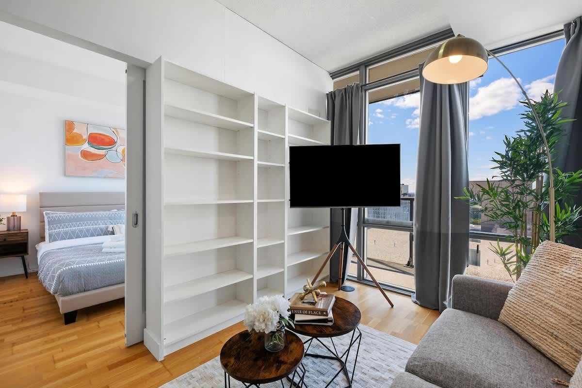 - Relax in a stylish space with a spacious patio for a city escape - Indulge in lush amenities: gym, pool, sauna, perfect for work and play - Stroll to diverse eateries, vibrant shops, and seamless public transport - Enjoy speedy WiFi and a fully equipped kitchen for a comfortable, modern stay - Book today and uncover ultimate urban relaxation in this elegant hideaway!