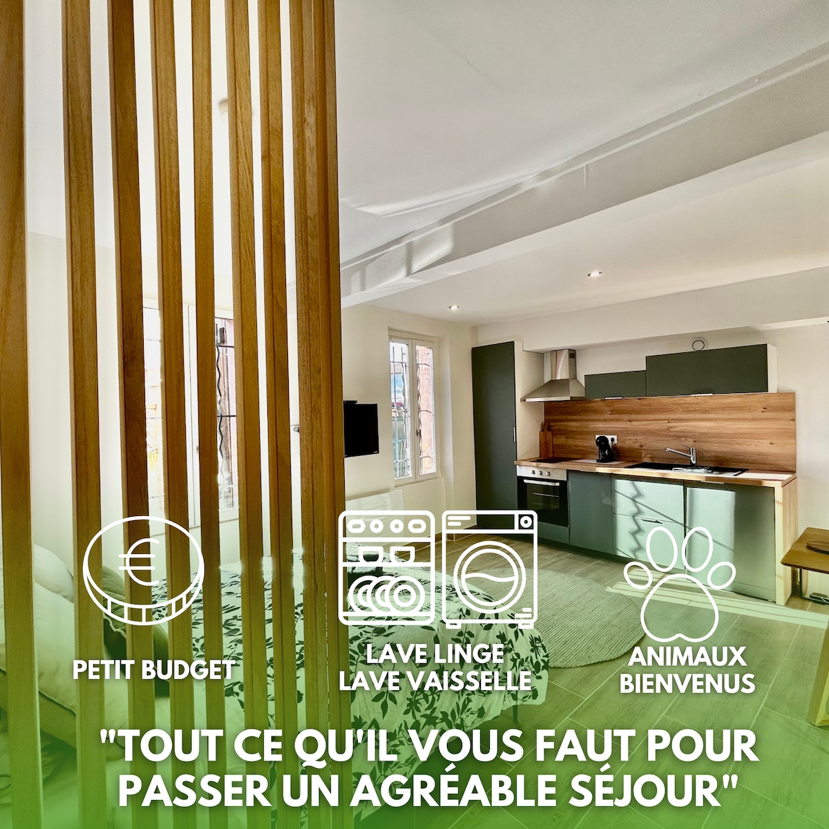 J’ai aménagé cet appartement avec soin pour que vous vous y sentiez immédiatement chez vous. Les fenêtres donnent sur un petit jardin agrémenté d’un superbe mandarinier, dont vous pourrez profiter des fruits en saison. Situé dans une charmante copropriété du quartier des Chalets, apprécié pour son calme et sa qualité de vie, l’appartement se trouve à deux pas de l’hypercentre. J’espère que vous vous y sentirez aussi bien que moi !