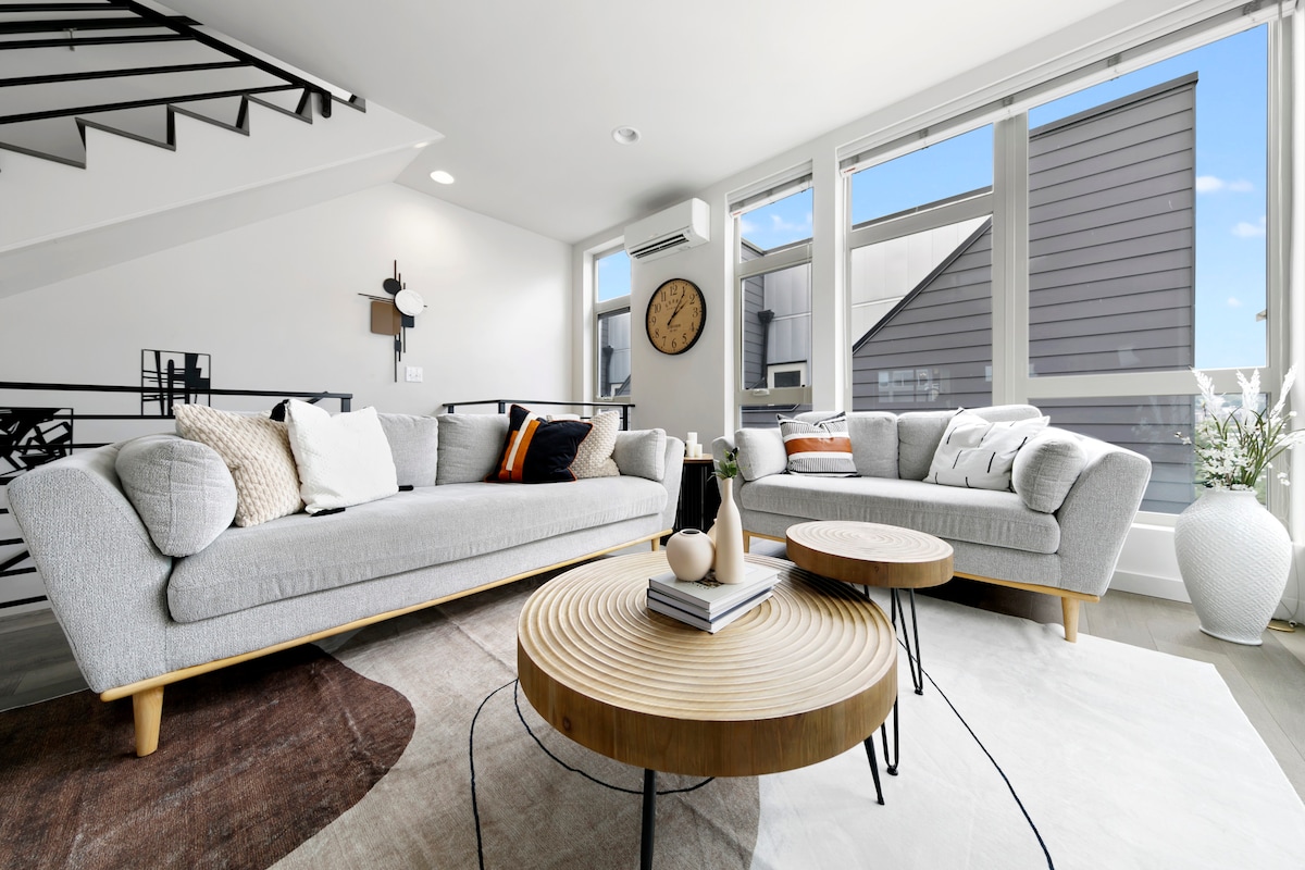 Fremont scenic property showcasing expansive Mt. Rainier and skyline. A stunning modern and urban multi-level townhouse with floor-to-ceiling windows, contemporary kitchen, and a spacious rooftop deck with a large gas fire pit! Luxury accommodation run by friendly locals, here to make your stay relaxed and seamless :) There are two bedrooms, with king and queen beds, and also a queen size sofa bed in the main living space. ** PLEASE NOTE: The garage can accommodate compacts or small SUV only