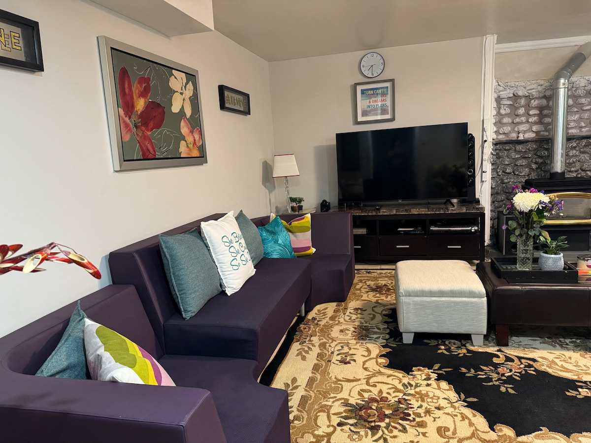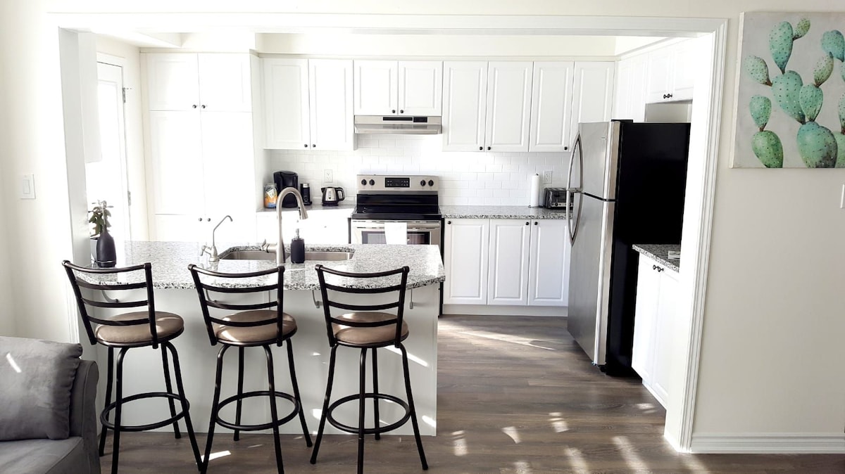 Licence # 25-308528 Modern 1 bd apartment below family home in the Guelph West End. ~2 min drive to Conestoga College ~5 min drive to Rec Centre, Costco, Zehrs ~10 min drive to University, Downtown, Stone Rd Mall ~2 min walk to bus stop -Free 1 parking 🅿️ on driveway+ street parking Apr-Dec True home away from home: *full-stocked/equipped kitchen & bath *washer/dryer *queen size bed, 2 sofa beds *work desk The hosts live above the unit and are available if needed but also provide you privacy