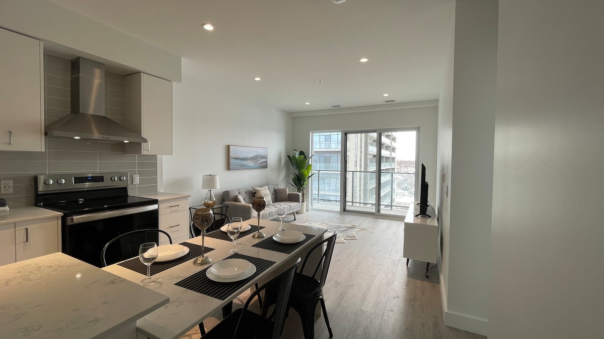 Welcome to our open concept highrise with city views in the heart of Kitchener-Waterloo, where style and comfort meet to create a truly memorable stay. This 1-bedroom open concept unit thoughtfully designed to accommodate up to 4 guests, making it perfect for couples, small families, or solo travelers looking for a modern and cozy retreat. ✔ Fully Equipped Kitchen ✔ Comfortable Bedroom w/ Queen bed ✔ Open Concept Living Area ✔ High-Speed Wi-Fi ✔ Free Parking ✔️Access to gym Learn more below!