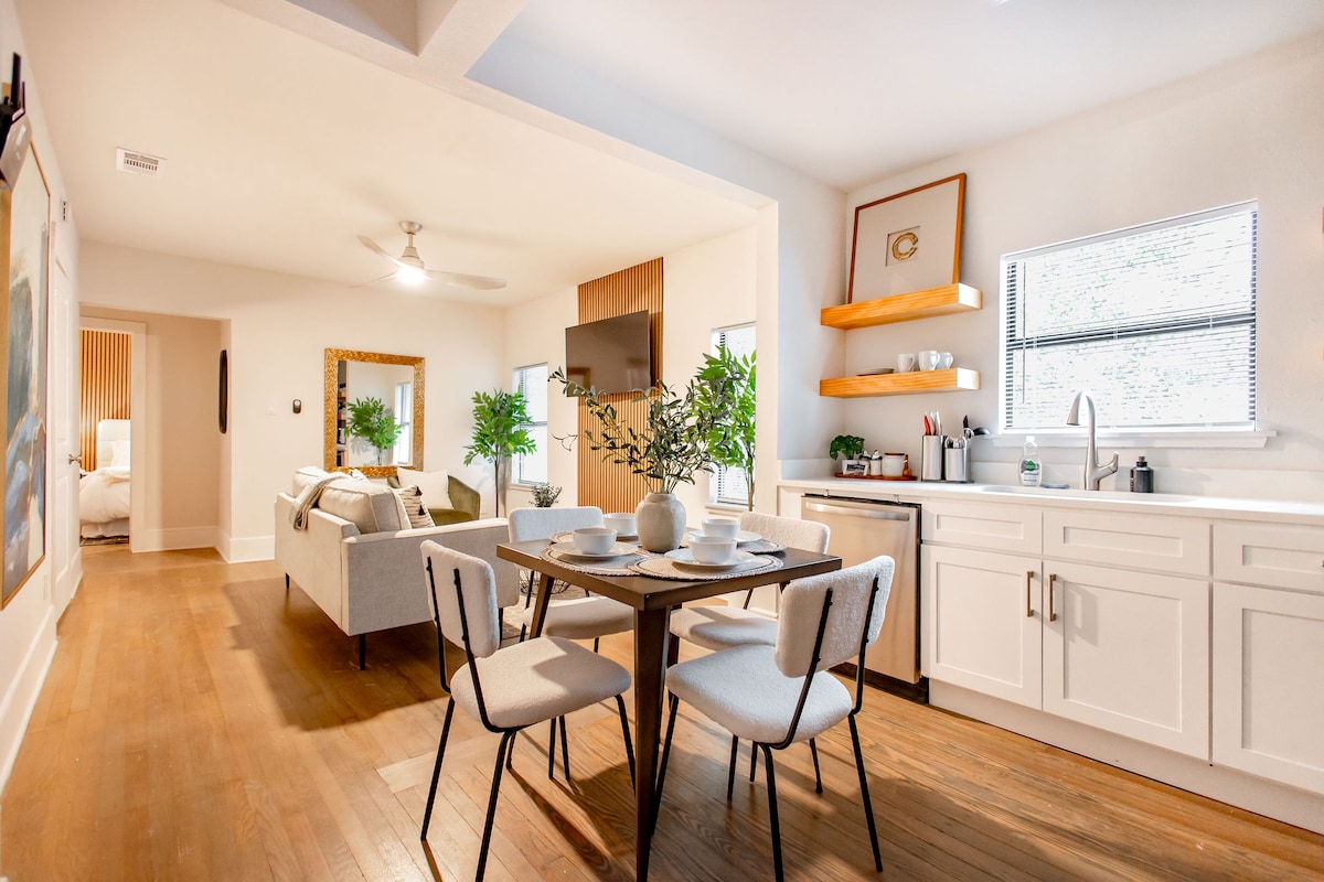 Indulge in the tranquility of The Carriage House. This lovingly updated space features an open-plan living area, contrasting textures and patterns, chic furnishings, kitchenette, and shared access to the lush backyard with a fire pit. Come and enjoy Texas sunshine through the gracious windows on all four walls of your private apartment.