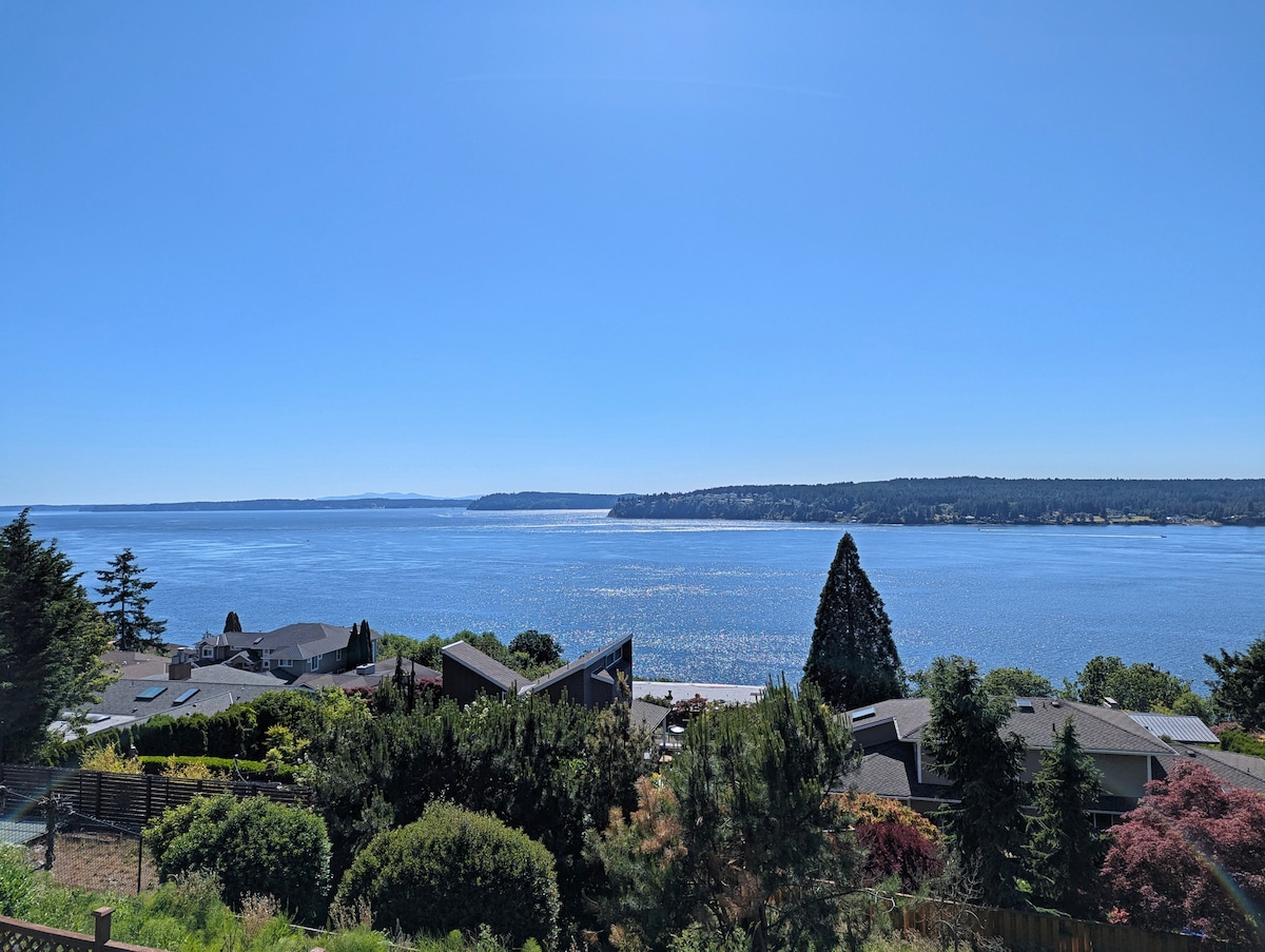 Great 180 degree Views from south end of Vashon Island. Spectacular views of Mt. Rainier and Pt. Defiance. Tacoma city and Commencement Bay lights up views at night while Pt. Defiance is dark. This cozy 1 bedroom has a king size bed, 1 bath with a shower and unique 1/2 size tub. The views are amazing from the bedroom, kitchen and living area. At high tide you feel like you are on a boat. Access to our private boat ramp for kayak, SUP, or other small watercraft. Come enjoy being on the water!