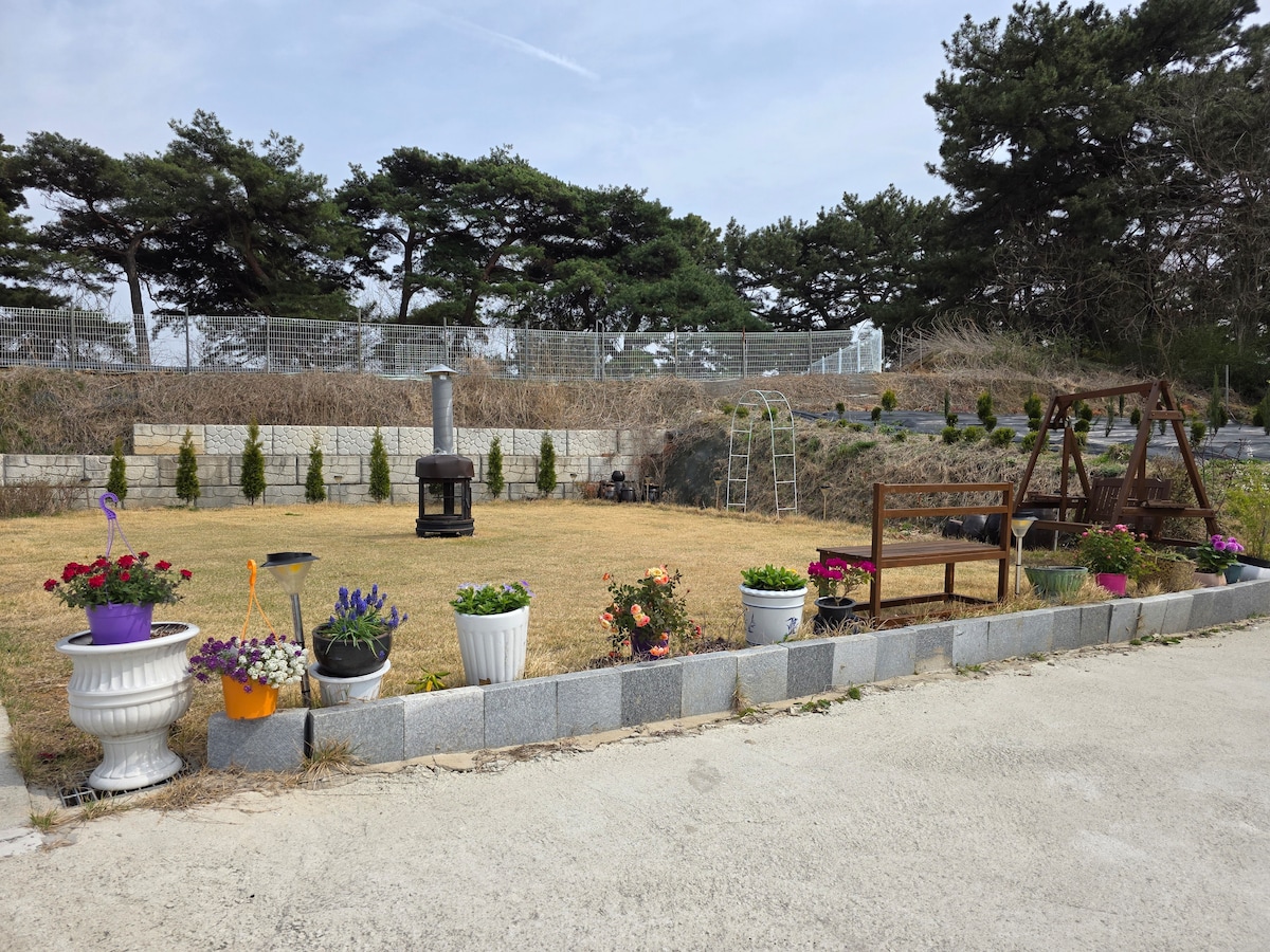 꽃이 많은 아늑한 주택입니다. 아무에게도 방해받지않고 조용히 힐링하기에 딱 좋은 곳입니다. 위치는 정산고등학교 가기전에 있습니다. 출렁다리까지는 차로 5분~7분 거리입니다. 또 칠갑산 등산하고 쉬시기 좋습니다. 마트는 차타고 5분이지만 시골이라 문을 일찍 닫아요. 미리 장을 봐오시면 좋습니다. 그리고 단독 주택이기에 가족,친구들 끼리 즐겁게 놀수있습니다. 아이들을 위한 모래놀이터도 있습니다. 공주에서 20분 세종에서 40분 대전에서 40~60분 거리에 위치합니다. 밖에서 바베큐와 불멍도 먹을 수 있습니다. (우천시 사용불가) 편히 쉬다 가세요^ ^