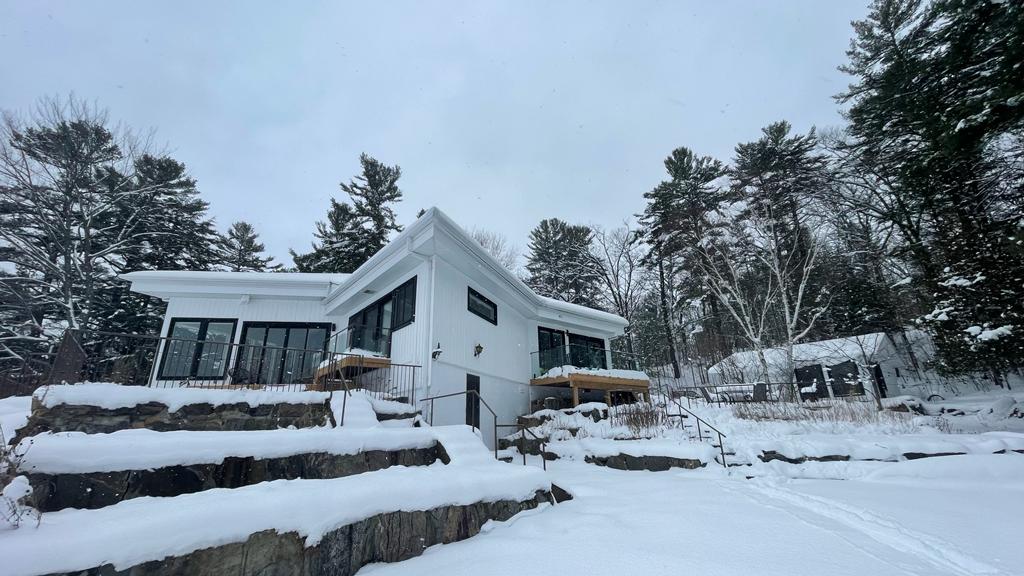 Welcome to our private, modern Scandinavian-style cottage, set on 3 acres of pristine land with conservation property across the water, ensuring ultimate privacy and tranquility. The cottage boasts floor-to-ceiling windows that invite natural light and offer stunning views of the Muskoka River and surrounding nature. Just 40 steps from the front door, you'll find a private beach and dock, offering calm, clear waters perfect for swimming—ideal for families with children.