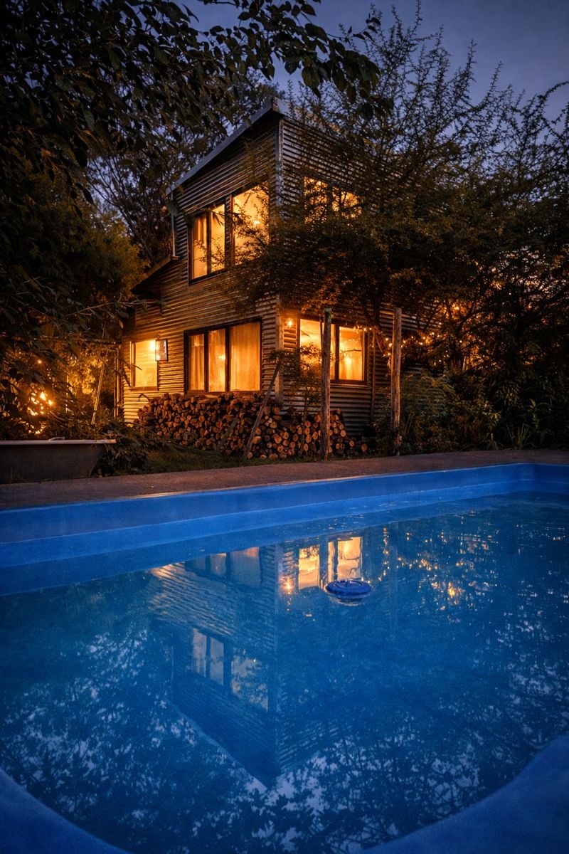 Casa ubicada en un campo de 20 hectareas de sierra y monte pero muy cerca del pueblo. Tiene una piscina, monte frutal y caballos. Es de un estilo rústico, con ventanales grandes. Es vecina al cementerio del pueblo para quienes sean supersticiosos. Aviso: la pileta recibe mantenimiento semanal pero al ser zona de campo puede acumular restos de hojas en el fondo