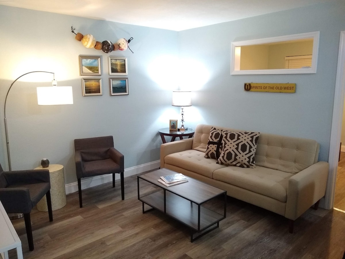 Newly remodeled first-floor condo just a super short walk to Upham Beach! Enjoy a private patio, queen bedroom, open living space, and full kitchen. 1 minute walk to the sand, close to tons of entertainment, bars and restaurants. Includes parking for one vehicle and beach gear—towels, chairs, umbrella, and buggy. Easy breezy coastal living.