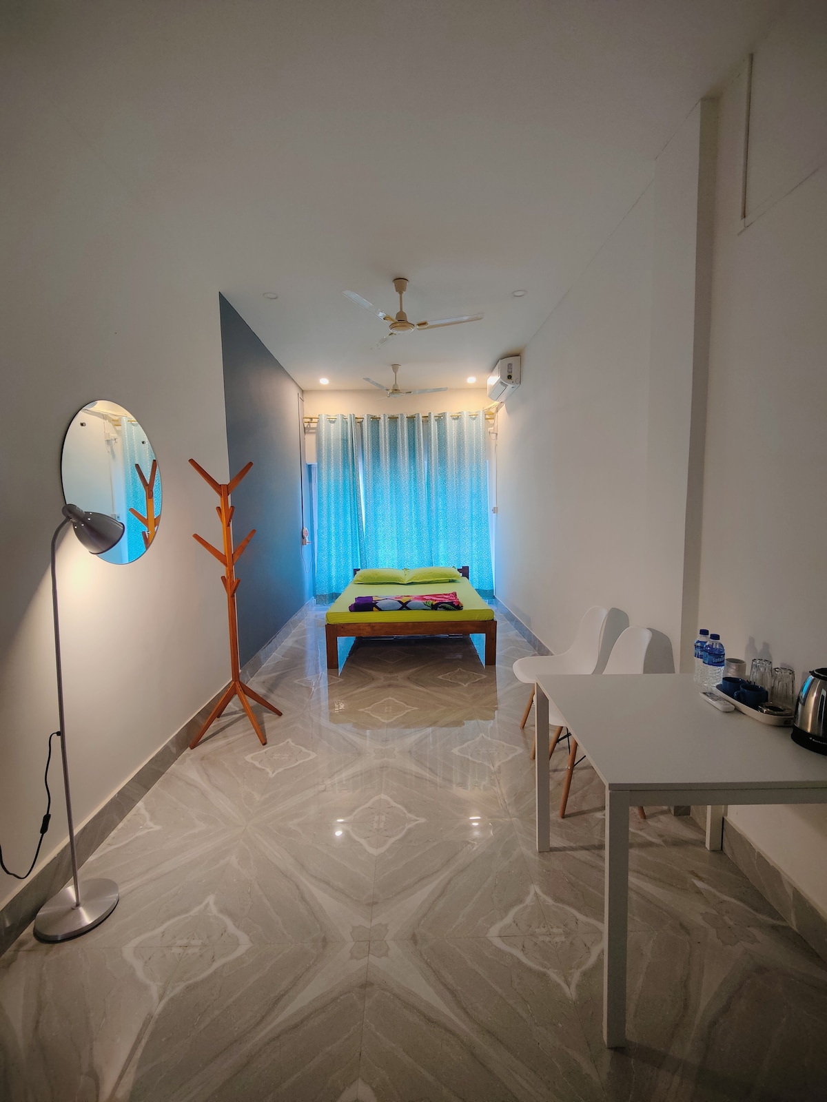 A vibrant and aesthetic home decorated with the feel of Santorini,Greece in the shades of white and blue. It is designed in an open-plan style offering plenty of space for guests. Guests will have access to the entire second floor of the building. It is a fully furnished 1bhk and none of the rooms are shared with other guests. **AC to be charged 300/- extra per day**