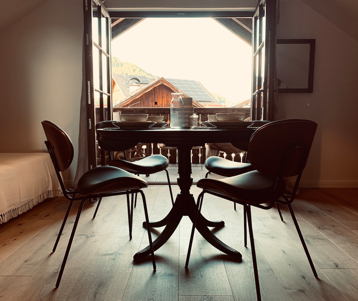 Loft im Atelier Dieses stylishe, gemütliche Loft in Etienne's Atelier liegt am Waldrand etwas außerhalb von Bad Ischl. Kunst- und Naturliebhaber kommen hier voll auf ihre Rechnung. Gehe auf Tuchfühlung mit dem Künstler Etienne, der im Erdgeschoß des Ateliers malt. Die Aussicht auf die malerische Bergkulisse ist berauschend. Von der Terrasse auf der Ostseite, kannst du beim Frühstück die Morgensonne genießen und hast einen wunderbaren Blick auf den Garten mit Teich und Grillplatz.