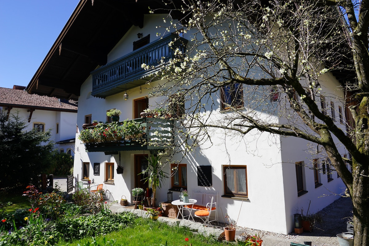 Unser liebevolles Haus mit Wohlfühlgarten liegt in absolut ruhiger Idylle mit Blick auf die Kampenwand und lädt ein sich vom stressigen Alltag zu erholen. In nur 5 Gehminuten erreicht man das Chiemsee Strandbad. Vor der Haustüre befinden sich sehr gut ausgebaute Rad- und Wanderwege in die Felder und Moore. Kinder sind herzlich willkommen und genießen diverse Freizeitangebote, wie z.B. Bauernhofbesuche. Wir stehen unseren Gästen mit Rat und Tat zur Seite. Bitte sprechen Sie uns an.