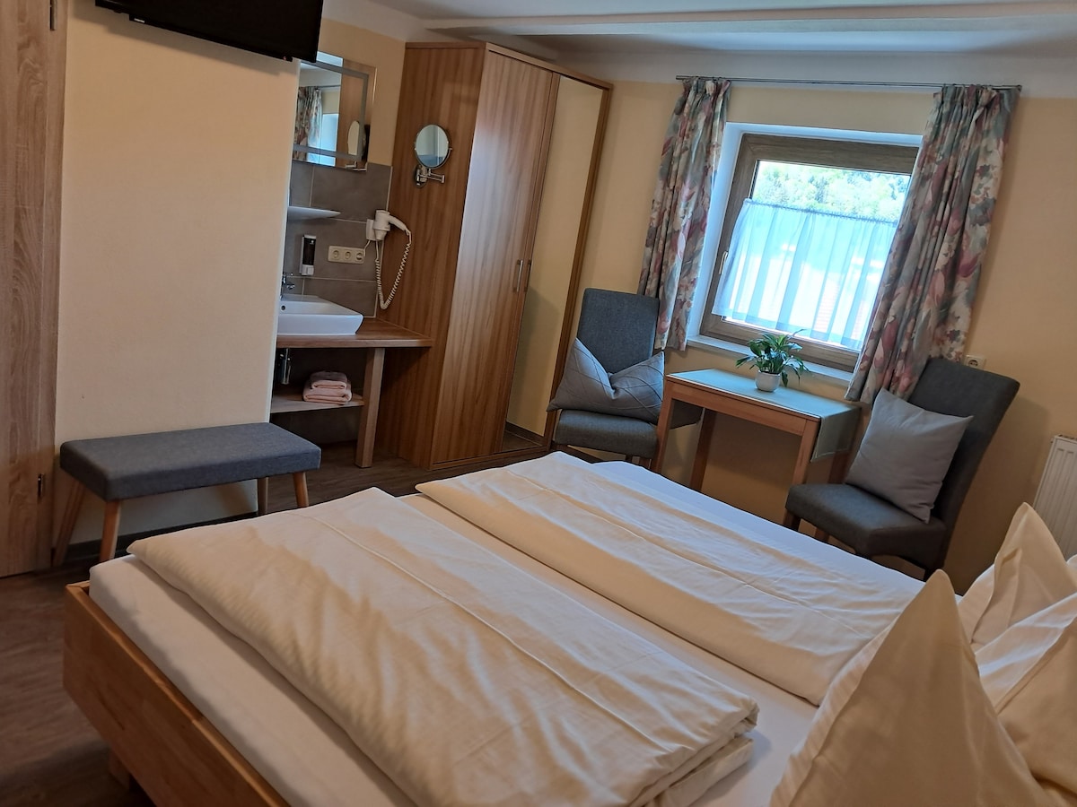This bright and airy single room extends over 15 square metres and fits one person. The Bavarian-style space includes a comfortable single bed, a modern bathroom with shower, a spacious wardrobe and a window that looks out onto a relaxing nature view. For guests who want to plan out their nature retreat in Unterwössen or do some reading while taking in the mountain views, the room also comes with a desk, a TV and a comfy chair.