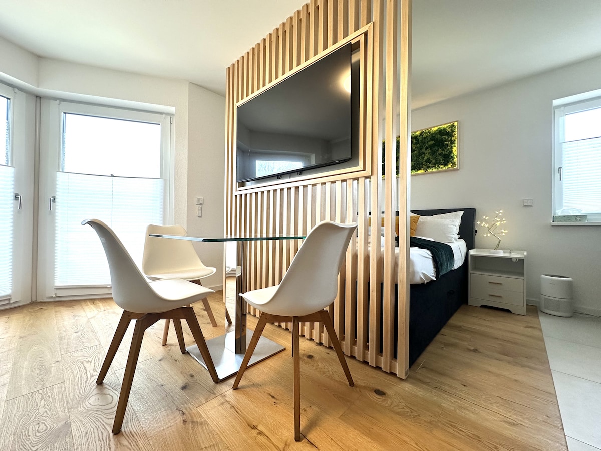 ☆ YAYstay - Genieße eine erholsame Zeit in unserem liebevoll und stilvoll eingerichteten 38m2 Deluxe Studio im 1. OG mit Aufzug (barrierefreier Zugang) Ob allein, zu zweit, oder als Familie, selbst für Besuch ist alles da: - 1 x Kingsize Boxspringbett - 1 x Couchbett 140/200 - Smart TV 56‘ - Kaffeevollautomat - Herd + Backofen - Waschtrockner und Trockner im Keller Die schwenkbare Fernsehtrennwand - ein echter Hingucker! Wir stellen hochwertige Bettwäsche und Handtücher zur Verfügung.ei