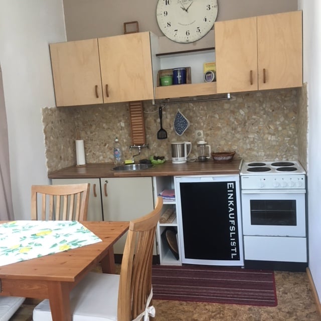 In 40 m²: Small kitchen, dining, living, and bedroom all in one. The very bright apartment with stone flooring is on the second story and reachable with an outside staircase - first you have to cross our chaos garage. Supermarkets in 10 -15 min, S-Bahn 6 min & 16 minutes to main station. From airport, go with S-Bahn to Laim then with S2 Dachau/Altomünster/Petershausen to Karlsfeld! FYI: we have a couple of chickens in the garden - morning ¨cock-a-doodle-do¨ included!!