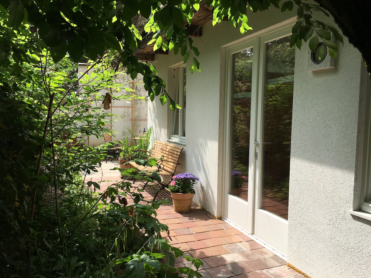 Small 25sqm studio garden house in a green environment. It has an own entrance and has a private terrace. Very quiet and safe location close to Nymphenburg palace and canal. Nevertheless it is not far from the centre, subway ride takes only 5 minutes to Munich Central Station. The garden house underwent a reconstruction and is completely new refurbished.