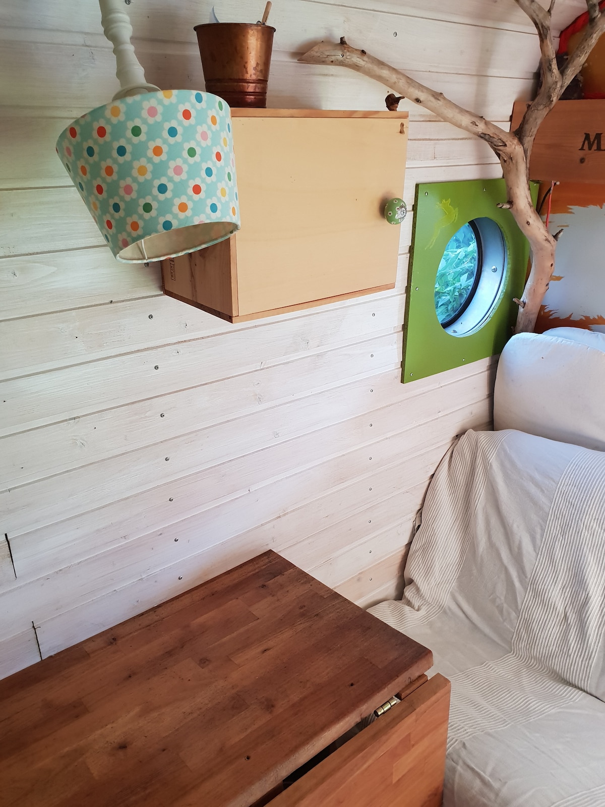 Small space but with everything you need: three beds are located on two small galleries that can be reached with ladders. Downstairs there is a sofa bed and the living/dining area. Through a large window, you have a wonderful view of our orchard. We are private hosts and don't do hosting commercially. As it is part of our everyday family life, it can happen that not everything runs smoothly. Feel free to contact us and we will find a solution :-).