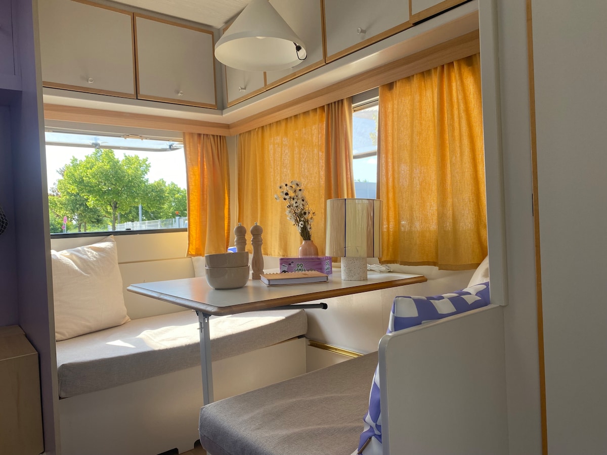 Der 50 Jahre alte Wohnwagen mit 9 qm wurde renoviert. Er verfügt über ein Mini WC, ein Waschbecken mit Wasser und über 2 Herdplatten, Wasserkocher, Kaffeemaschine, Grundausstattung Geschirr, 2 Einzelbetten, Kühlschrank und einen großen und einen kleinen Tisch und WLAN. Die Betten verfügen über folgende Maße 190cm lang und 73 cm breit. Zusatzschlafmöglichkeit für eine dritte Person möglich Höhe des Caravans 180cm