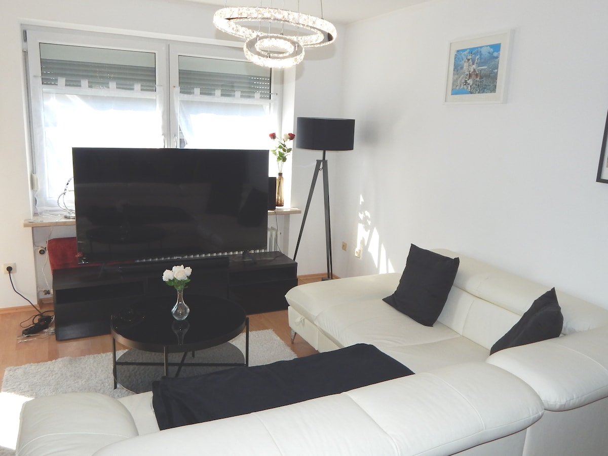 This unique family apartment invites you in the mountains of Germany and Austria for hiking, mountain biking, skiing, snowboarding and much more. The apartment has two family rooms with 4 sleeping places each. It has three balconies, a cellar compartment and an underground parking space. Further highlights: - modern bathroom with shower&bathtub - fully equipped kitchen incl. washing machine & dryer - baby high chair & baby crib - dog accessories if needed