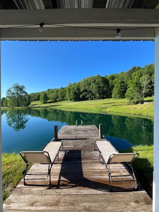 The cabin is located on a dirt road on our farm with a beautiful pond and an amazing view! This off-grid, cabin has two queen beds (100% cotton sheets), a mini-kitchen with a battery-ignition gas range, solar powered refrigerator, solar lighting, a wood stove, an outdoor shower, a fire pit, and an old-fashioned outhouse. An expansive porch and dock provide comfortable outdoor living. A seasonal favorite, the cabin is available May-Oct.