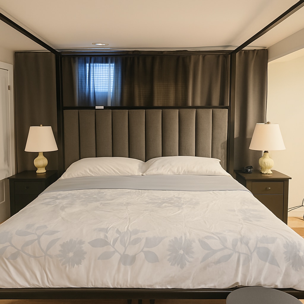 Inspired by a luxurious presidential suite, this thoughtfully designed walkout basement retreat blends upscale finishes with cutting-edge smart features for a truly elevated stay. Experience hotel-style comfort with the privacy of home. Enjoy a fully equipped full-size kitchen, a serene king-size bedroom, spa-inspired bathroom, cozy TV room, and an elegant bar cabinet. The open-concept layout is filled with natural light from full-size windows and offers step-free access to a private backyard.