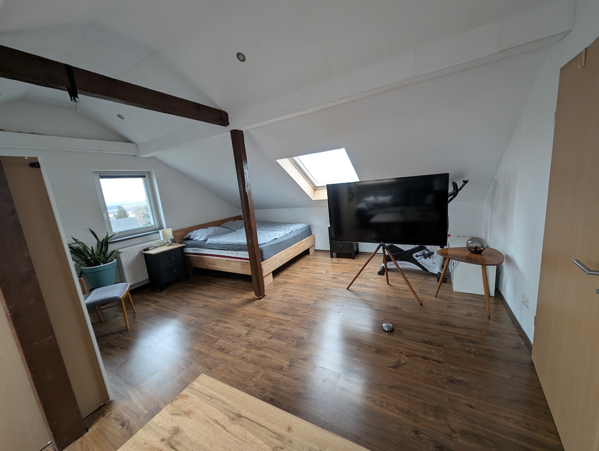 Kleine, offen gestaltete Ferienwohnung/ Einliegerwohnung im Erdgeschoß mit Einbauküche (Kaffeemaschine, Toaster, Wasserkocher, Kühlschrank mit Gefrierfach), Bad (Shampoo, Duschgel etc.) mit Dusche und WC, Handtücher, Bettwäsche, Föhn. Schlafzimmer mit Kleiderschrank, Wohnzimmer mit Schlafsofa, Esstisch, TV. Sagt uns gerne Bescheid wenn wir die Schlafcouch beziehen sollen. Familie mit Kinder sind herzlich willkommen, es ist ein Hochstuhl vorhanden sowie verschiedene Spielsachen.