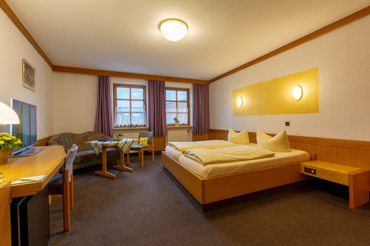 Our holiday home has 2 bedrooms and can accommodate up to seven people. There is a double bed in the bedroom (with a cot if required) and 2 single beds in the children's room. If required, a sofa bed in the living area offers space for at least one additional guest. From the living area with Swedish stove you can go directly into the fully equipped kitchen. A work area for a possible home office completes the offer. The house is also equipped with air conditioning and a washing machine.