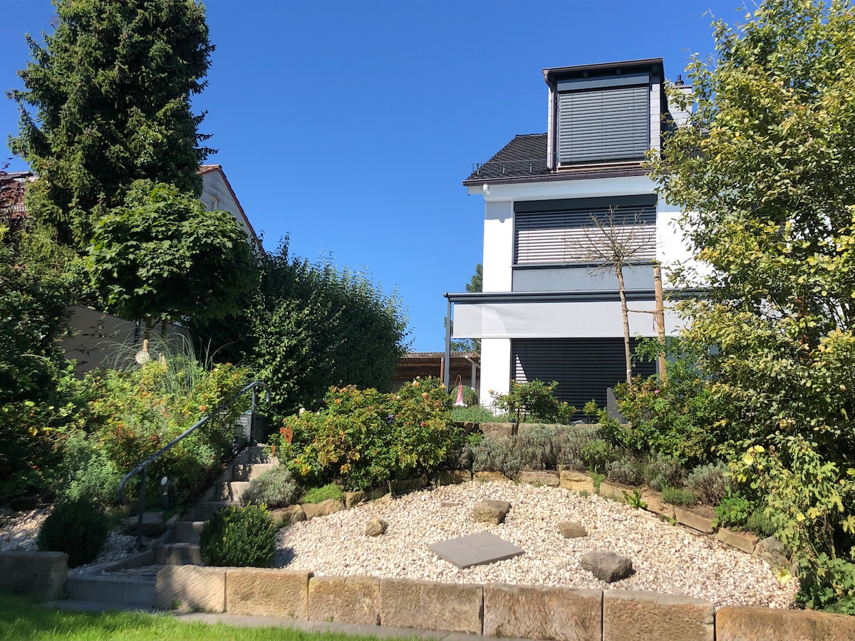 We welcome you in the city centre in our guest room. Make yourself at home in an historic and reconstructed city house in Erlangen. An own bathroom, a small garden, a wooden ceiling and a roof deck make it a real feel-good oasis.