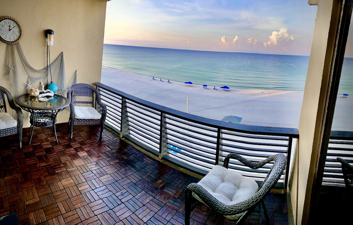 NO EXTRA FEES AFTER BOOKING! Wake up to Gulf views from your PRIVATE BEACHFRONT BALCONY in this charming, low-rise condo. Step directly onto sugar-white sand and emerald waters just outside your door. Enjoy a year-round, seasonally heated pool with an easy walk to Pier Park for dining, shopping, attractions, and nightlife. Looking for different dates or layout? I own 5 condos in this building. Click my host profile, then scroll down to view all of my listings.🌴