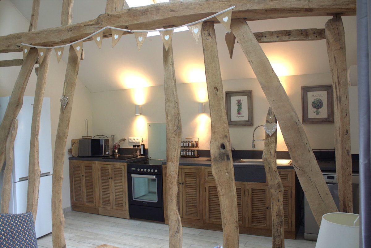 Charming single storey house with wood burning fireplace south facing west private and enclosed garden and terrace. This cute place, nestled in an outbuilding of the owners' house, is located on the edge of a quiet lane with a large park with trees, nature and meadows as neighbours. This place, not far from the Baie de Somme, the sea and the forest, will be ideal for a weekend, a holiday, or a telecommuting break for couples or families.