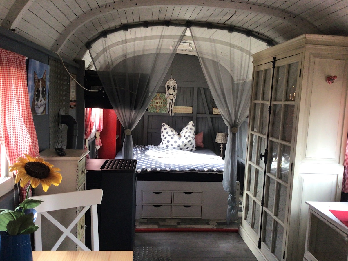 Our vacation cabin offers simple relaxation for 2 people with a double bed. On request there is space for a folding bed or crib. The fully equipped kitchen includes crockery, cutlery, pots, hob and fridge. A WC is available, the shower is in the adjoining house. Additional: TV/SAT, dining area and terrace. Please note: The hut is unheated and not air-conditioned, therefore weather-dependent booking.