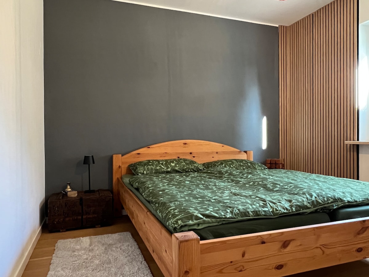 2. OG mit Wohnküche und Zimmer mit Bett+Sitzecke.Dachschrägen machen es sehr gemütlich.Bad ist aussergewöhnlich wegen der Holzfließen-man fühlt sich wie in einer Berghütte. Hinter dem Haus über den Parkplatz könnt ihr (für Gäste kostenfrei) ein großes Reha-+Fitness-Zentrum nutzen.Schön sind vor allem die drei Saunen, wenn man am Abend entspannen will (Finnisch, Bio und Infrarot). Die privaten Gartenanlagen sind für Gäste nicht ohne Absprache zu nutzen -das bitten wir zu beachten (Privatsphäre!)