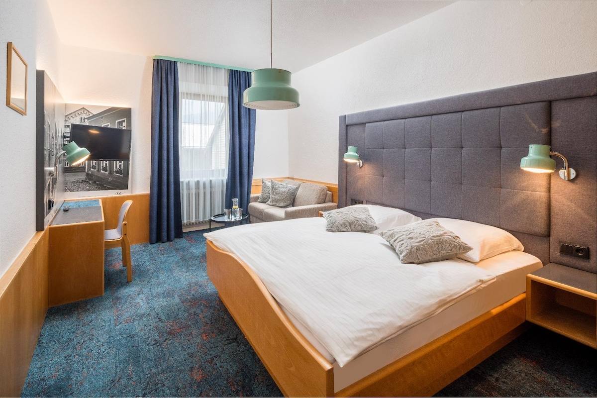 Featuring two beds, this room is perfect for friends or colleagues travelling together. Modern décor, complimentary Wi‑Fi and access to the bar and sauna create a balanced environment for work or relaxation. Visitors can enjoy the nearby golf course or hike in the Waldnaab Valley before returning to a restful space.