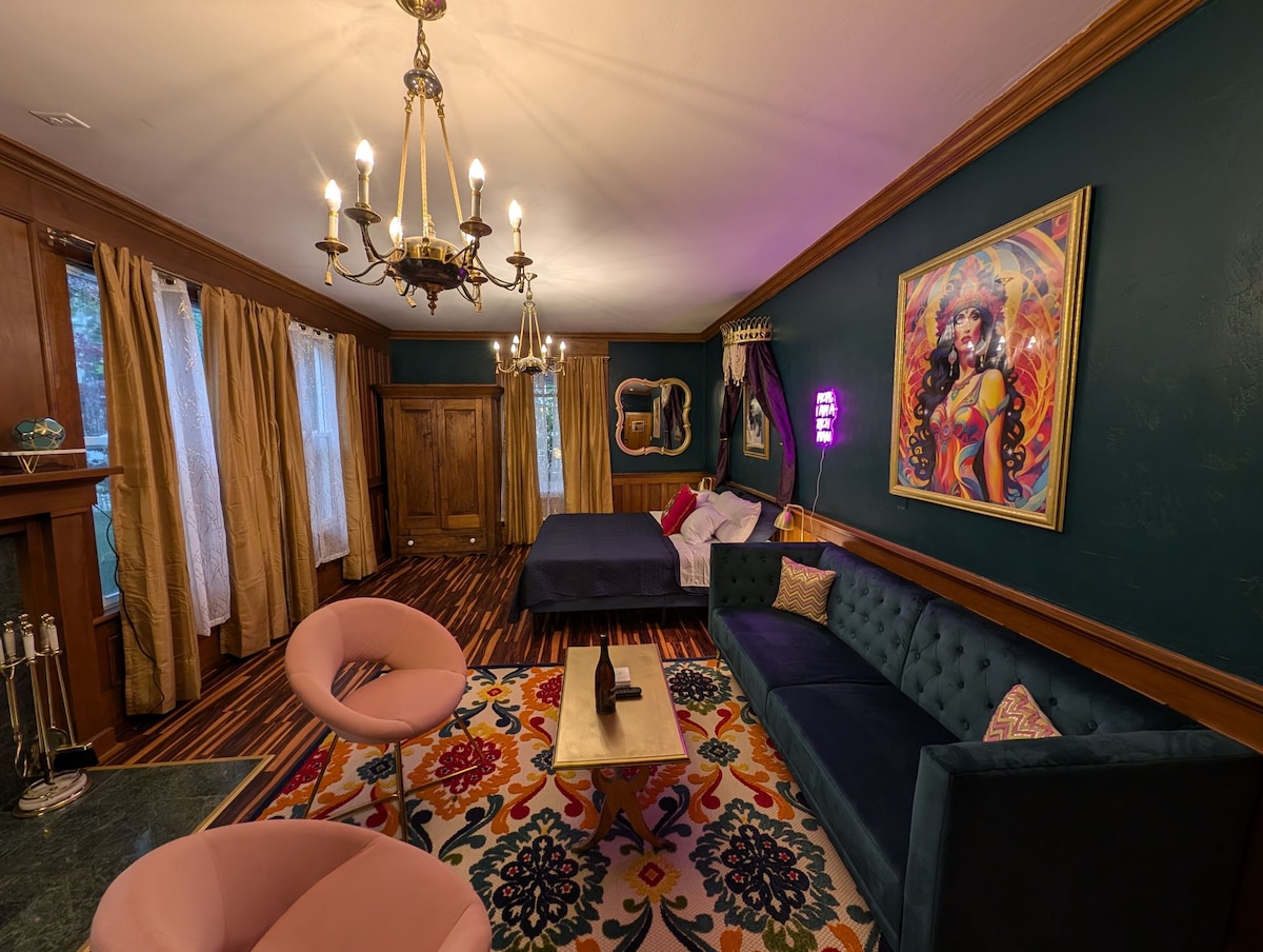 Travel like royalty and stay at The Queen Hotel, downtown Sturgeon Bay! Vibrant colors, fun art, full kitchen, huge walk-in two-person shower and spacious bed/living area make this Suite a fun and comfortable retreat when you're not out conquering the county. King size bed, Smart TV, fast Wi-Fi and velvety furniture give the room comfort not found anywhere in the neighborhood. The Suite shows love to Cher and the hotel's fun decor highlights women and royalty alike. All welcome, LGBQT+ friendly.