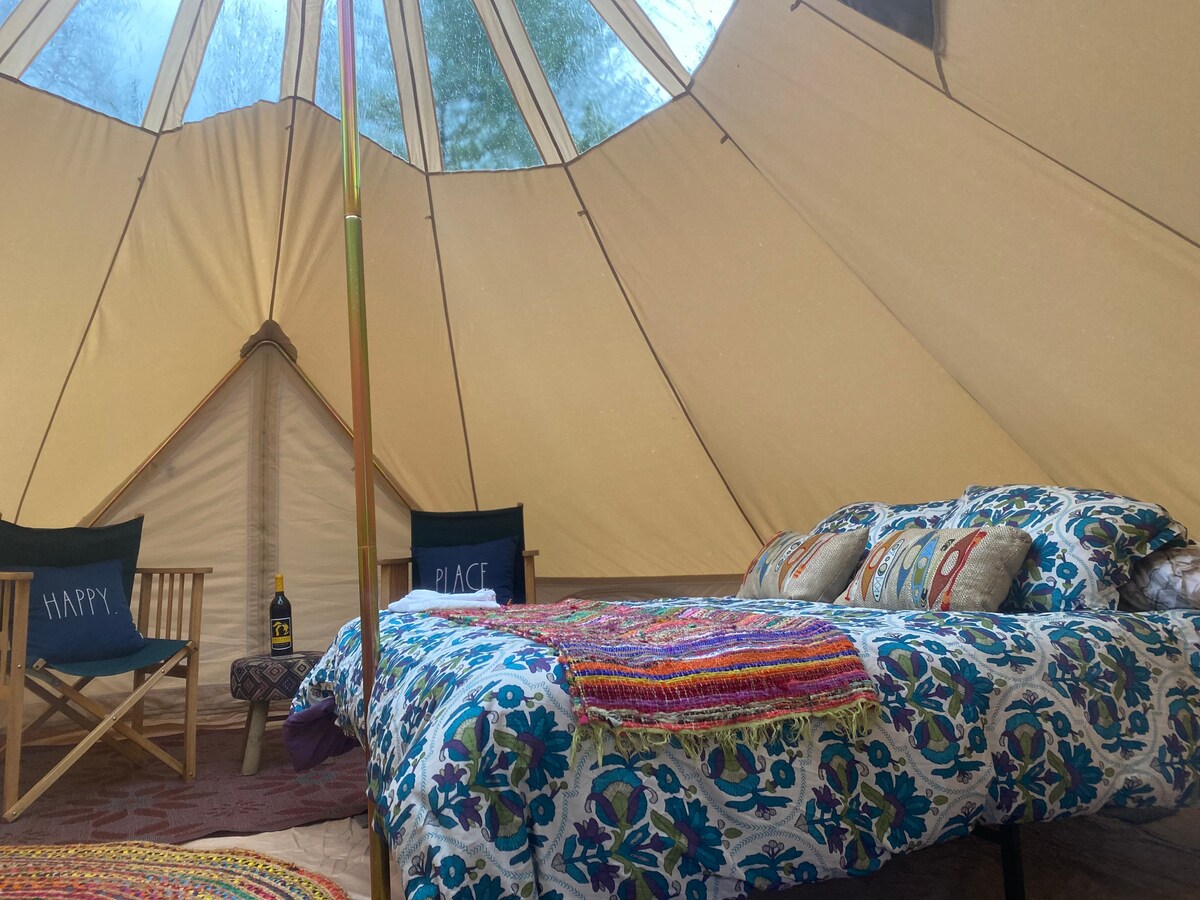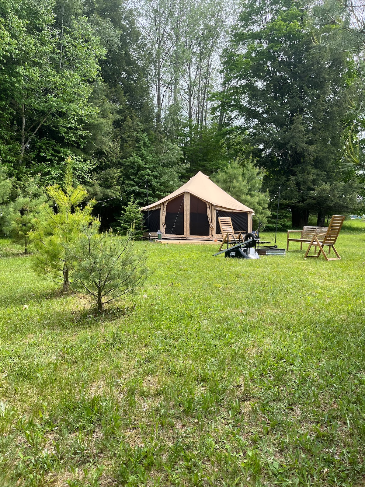 Relax and enjoy all that nature has to offer on the rolling hills of Lost Woods Farm + Forest, a 160 acre Eco Resort just minutes from Boyne Mountain. Explore trails, creeks, wildlife and collect wild berries during your stay. Our bell tent sits on top of the hill with the most spectacular view of Boyne Valley. Inside you will find a queen memory foam mattress, lux white linens, extra blankets, portable fans, lanterns and bonfire supplies, table and chairs, cooler, and private fire pit.