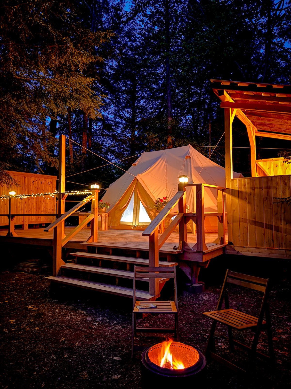 The Nest is a NEW spacious, luxuriously furnished canvas bell tent hidden away in a secluded wooded glen. Immerse yourself in nature while indulging in special touches that make you feel comfortable and well cared for. The Nest includes a queen bed with luxury linens, towels, robes and slippers; outdoor shower; outdoor kitchen with cooktop, fridge and sink; bbq and private campfire; and vertical log outhouse. Resort amenities include wood fired sauna, sand beach, canoes, kayaks, hiking, fishing.