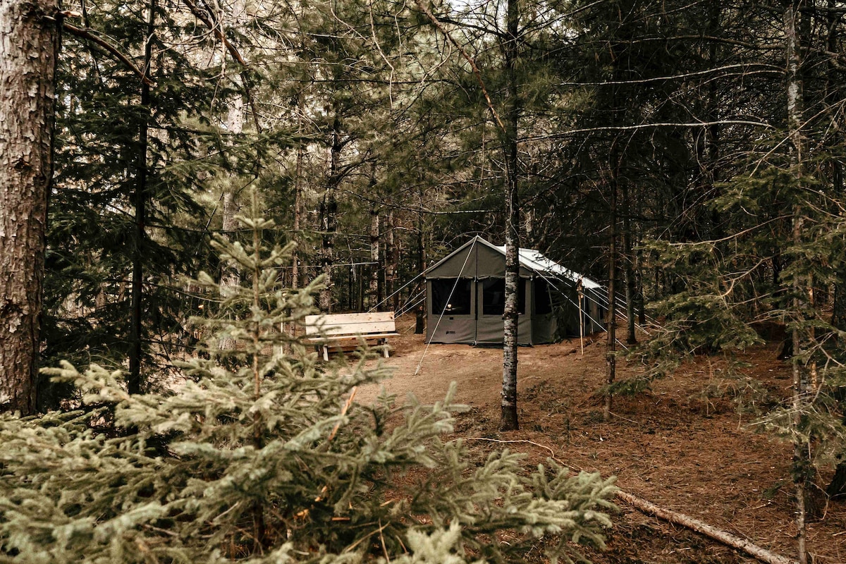 NATURE ELEVATED. ONE SEAMLESS STAY. EVERY RESORT AMENITY INCLUDED IN RATE. ONE PRICE = EVERYTHING. NO SURPRISE FEES--JUST GOOD TIMES. | Stay in Baby Face Nelson's Luxury Tent #14 at POV Lake Resort. Tent spaciously sleeps 4 with a full size futon and a queen bed. Stunning Northwoods view & short walk to easy lake access w/sandy beach. On site hiking trails, paddleboards, kayaks, canoes, game room, general store & stargazing. Boat rental & romance packages avail. No pets or hookups.