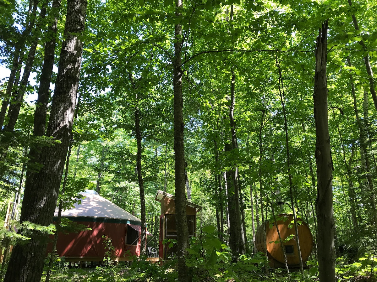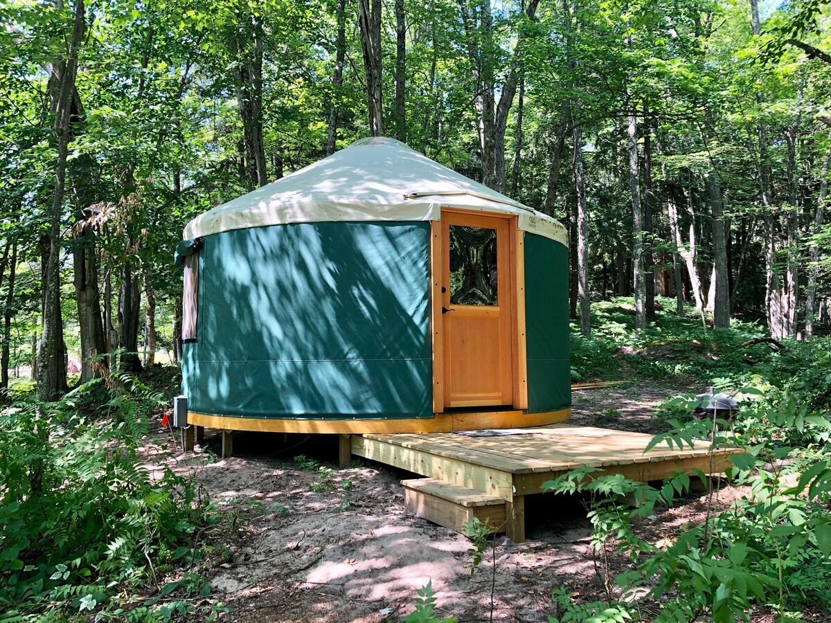 Glamping at its finest! This 16’ Yurt is tucked into the woods at Northwoods Resort. Just across the street from AuTrain Lake w/ full beach access. The yurt has 1 queen canopy bed, a cot under the bed for addn sleeping, cable tv, small refrigerator, microwave, keurig coffee maker, small charcoal grill, bonfire pit and chairs! The 1/2 bathroom is located just a short walk away in the laundry room for the resort as well as an outdoor shower. Also shared beach,dock, boat,canoe,kayak rental for use!