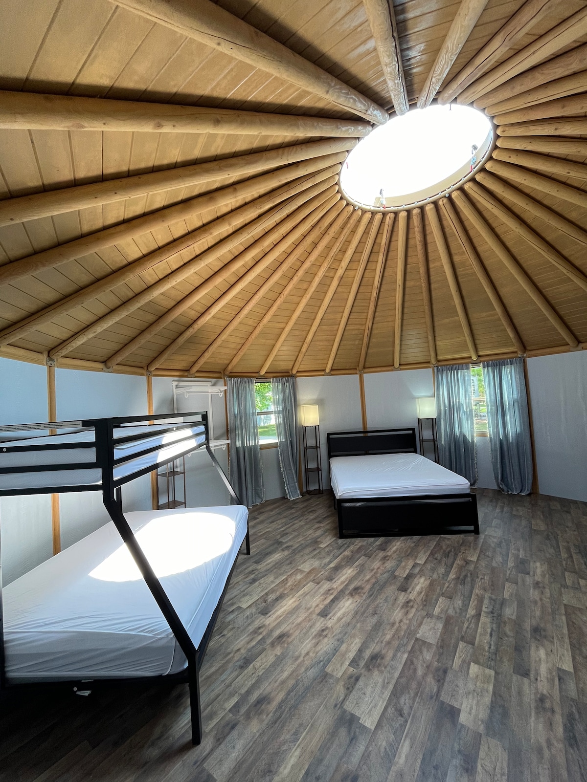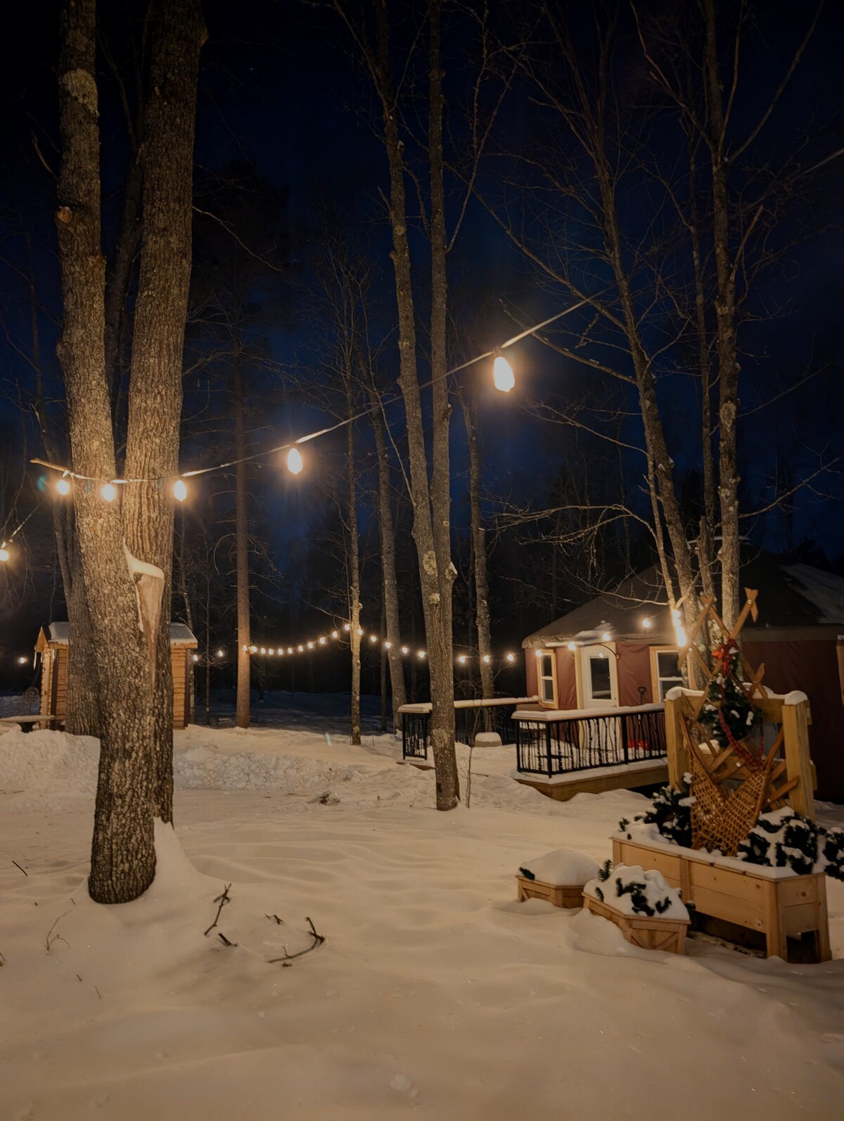 Our luxury yurts are fully insulated and equipped with heat, electricity, piping hot water, a full kitchen, bathroom, and a spacious living area. Relax in the 6–8 person sauna just steps away, enjoy the bonfire pit, s’mores, HBO Max, nearby trails, and free delivery for gear rentals. We’re happy to help with reservations, rentals, and personalized recommendations to make your Northwoods stay unforgettable. Inquire about deals, and booking another Yurt for larger groups!
