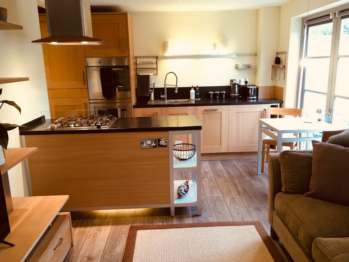 This newly decorated flat is situated in Weston village, Bath. Easily accessible to Bath city centre by regular buses, the re-cycled bikes, available at the flat or a 40 minute walk. This stylish flat is perfect for a romantic get away for two with a king size bed, double bath in a quiet area of Bath. The flat consists of an open plan living room and kitchen, large bedroom with en-suite bathroom including a shower over a double bath. Outside you'll find a patio dining area and private garden.