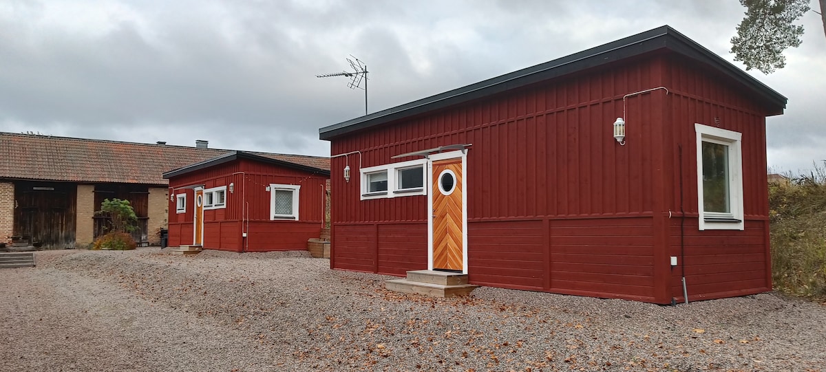 Litet gästhus som är ett gammalt härbre. Beläget på liten gård där även vårt hus ligger på samma tomt. Fullt utrustat kök. Toalett och dusch. 1 litet sovrum 90 säng på nedervåning. Kombinerat sovrum (2*80 sängar) och vardagsrum övre plan. Ca 180-200 cm takhöjd på nedre plan i köket. 5 minuters promenad till mysigt strandbad i sjö. Lantligt med hästar inpå knuten. 300 m från roslagsleden. 5 km bad i havet. 9 km till Älmsta med Ica och restauranger. 25 km till Norrtälje.